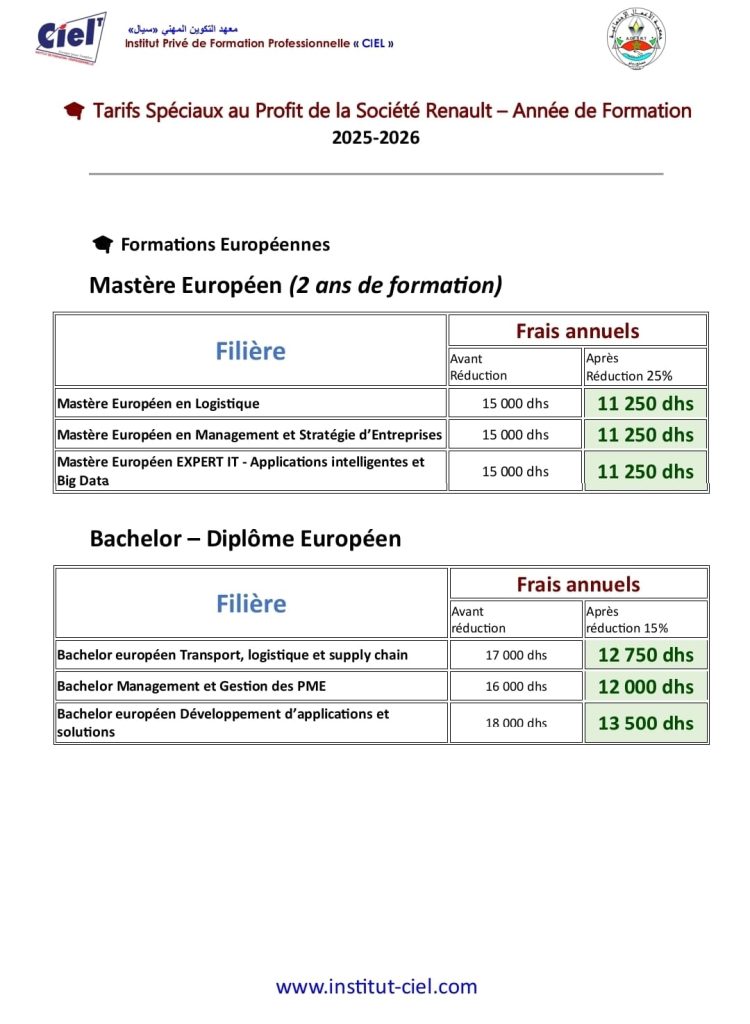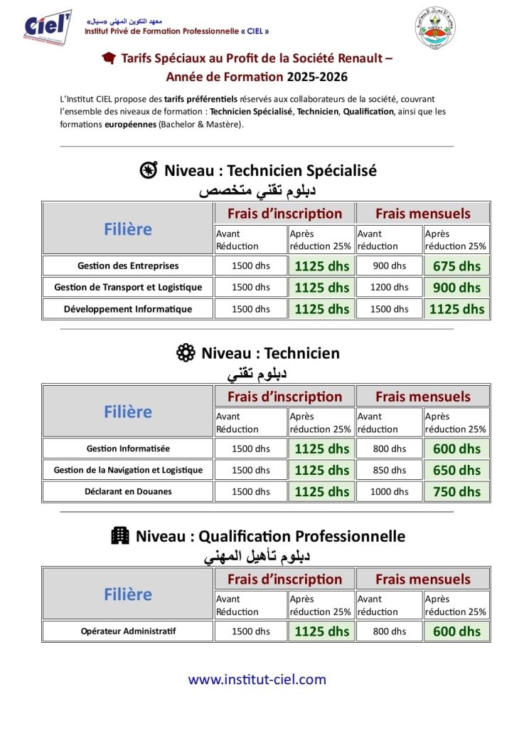 تعلن جمعية الأعمال الإجتماعية لمصنع رونو، عن عقد إتفاقية شراكة مع معهد التكوين المهني ” سيال ” ، وذلك من أجل إستفادة جميع الأجراء من أثمنة تفضيلية عن العموم .