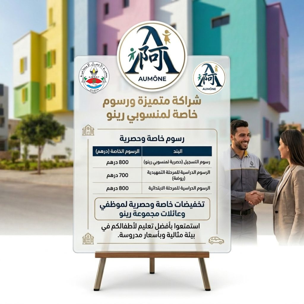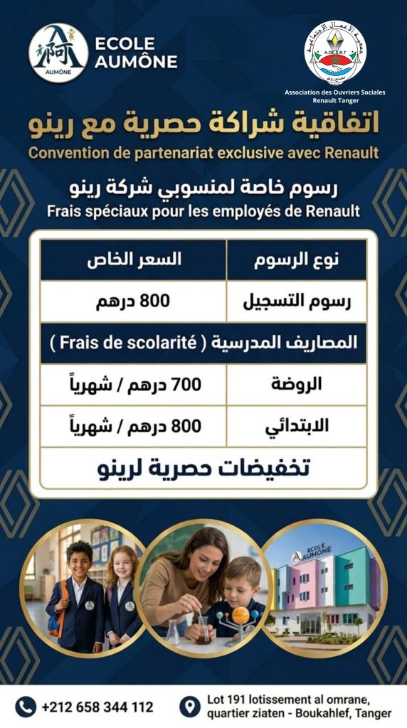 تعلن جمعية الأعمال الاجتماعية لعمال رونو بطنجة عن إبرام شراكة حصرية مع مدرسة Ecole Aumône، تتيح امتيازات خاصة لفائدة أبناء المستخدمين.وتشمل هذه العروض تخفيض رسوم التسجيل إلى 800 درهم، مع مصاريف شهرية محددة في 700 درهم للروض و800 درهم للابتدائي، في إطار دعم الأسر العاملة وتسهيل الولوج للتعليم.