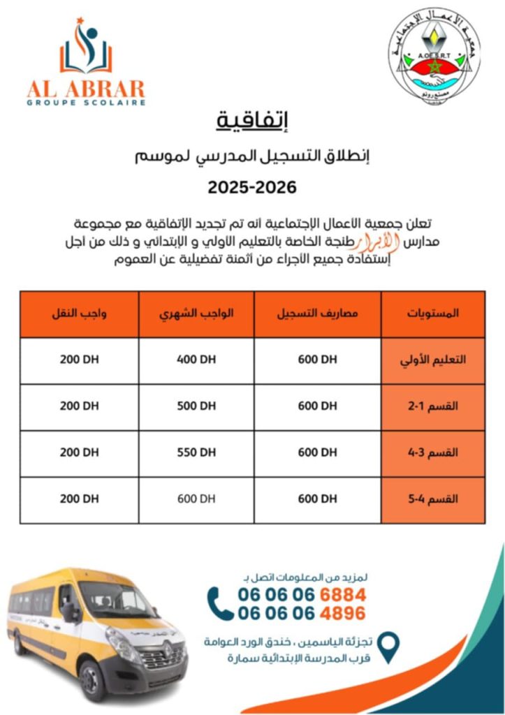 تعلن جمعية الأعمال الإجتماعية لمصنع رونو، عن تجديد الإتفاقية مع مجموعة مدارس الأبرار طنجة الخاصة بالتعليم الاولي و الإبتدائي، وذلك من أجل إستفادة جميع الأجراء من أثمنة تفضيلية عن العموم .